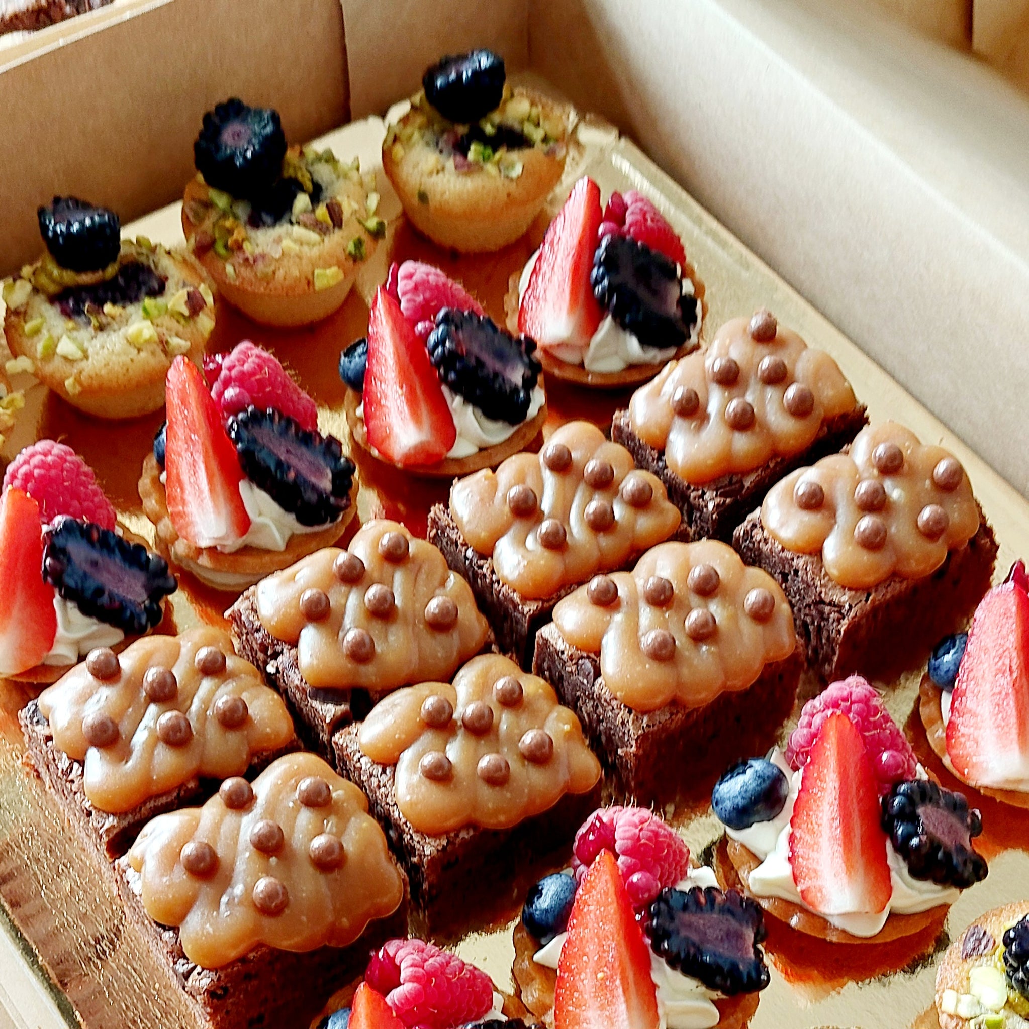 Dit leuke assortiment van mini's heb ik speciaal voor Boutique Office | Luxe Kantoorruimtes in Arnhem samengesteld en is een ideale mix voor een vergadering, feestje of als traktatie. Deze mix van mini tartelettes, mini financiers en mini brownies wordt geserveerd op een mooi plateau. Kies zelf je gewenste smaken of laat mij een leuk assortiment voor je samenstellen.Inhoud petit fours mix